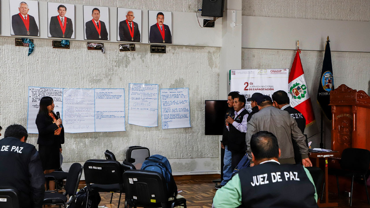 Trabajando con los jueces de paz. La Corte Superior de Justicia de Ayacucho en coordinación con la Oficina Nacional de Apoyo a la Justicia de Paz y la Oficina Distrital de Apoyo a la Justicia de Paz, viene capacitando a más de 30 jueces conciliadores del Distrito Judicial de Ayacucho, con la finalidad de fortalecer la función que cumplen en sus comunidades siendo la clave principal es RESOLVER LOS PROCESOS utilizando la CONCILIACIÓN entre las partes, en la II Jornada Nacional de Capacitación.