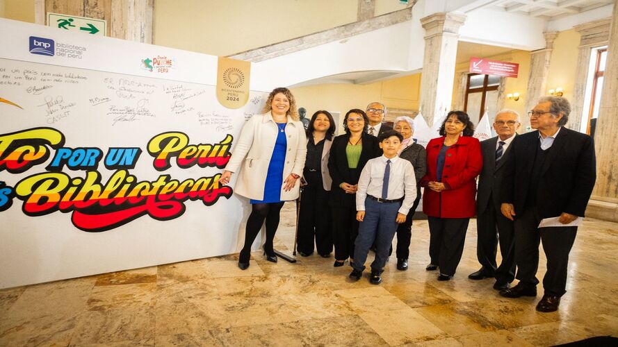 Publicada la Resolución N° 009-2024-BNP que formaliza el “Pacto por un Perú con más bibliotecas”, los representantes de diversas instituciones dieron inicio con su firma a este importante proyecto: Hugo Aguirre (presidente de directorio de Editora Perú), Ninoska Chandía (presidenta ejecutiva de IRTP), Olinda Rengifo (decana del Colegio de Bibliotecólogos del Perú), Ricardo Muguerza (presidente de la Cámara Peruana del Libro), Sandra Piro (presidenta del Conadis), padre Alejandro Muñoz (representante provincial de la Compañía de Jesús, párroco de San Pedro y Santuario Arquidiocesano del Sagrado Corazón de Jesús), Juan Yangali (director de la Casa de la Literatura), entre otros representantes de las instituciones públicas y privadas, así como municipalidades y universidades.