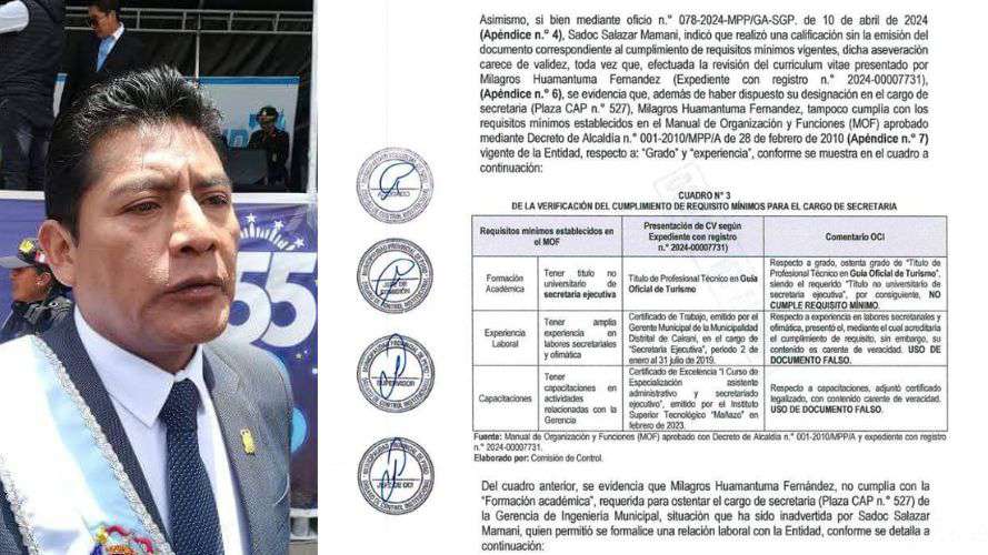 La investigación reveló que, además de ser favorecida por su cercanía con el alcalde, Milagros Huamantuma Fernández presentó documentos falsos para obtener el cargo. Entre estos documentos se encuentran certificados supuestamente emitidos por la Municipalidad Distrital de Cairani (Tacna) que acreditaban su experiencia como secretaria ejecutiva, así como certificados de cursos de especialización en asistencia administrativa y secretariado ejecutivo, que presuntamente fueron emitidos por el Instituto Superior Tecnológico de Mañazo.