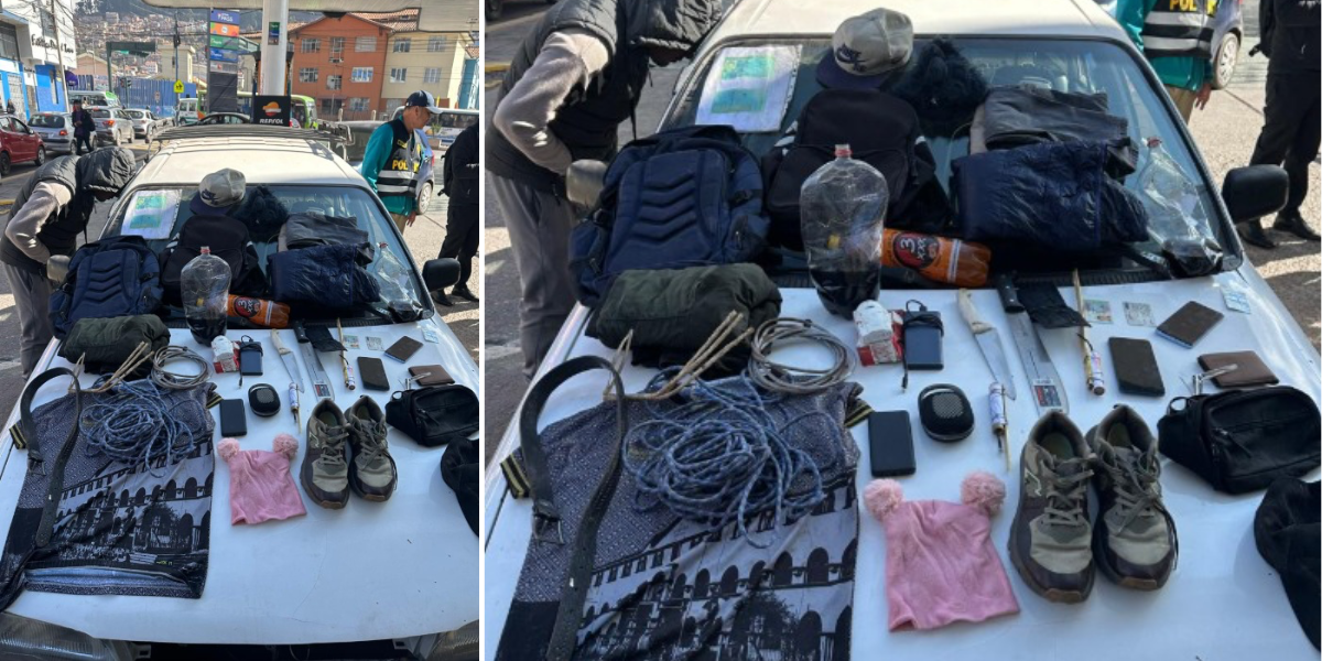 - Accesorios y objetos varios: un banderín y una camiseta del Cienciano, dos mochilas (azul y negra), un canguro negro, un morral negro, una soguilla azul, un cable acerado, dos billeteras vacías, tres celulares (dos de marca Honor y uno Redmi), dos cargadores portátiles, un parlante JBL, un foco sensor, once precintos de seguridad color negro, un cortaúñas, tres botellas descartables con contenido y dos cuetones.
