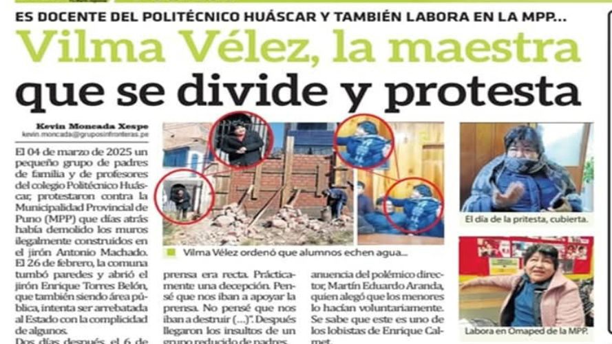 Es menester recordar que el 1 de julio de 2024, esa misma docente ordenaba a los alumnos de secundaria del Politécnico Huáscar, que echen agua a los muros de concreto que se levantaban de manera ilegal, con la anuencia del polémico director, Martín Eduardo Aranda, quien alegó que los menores lo hacían voluntariamente. Se sabe que este es uno de los lobistas de Enrique Calmet.