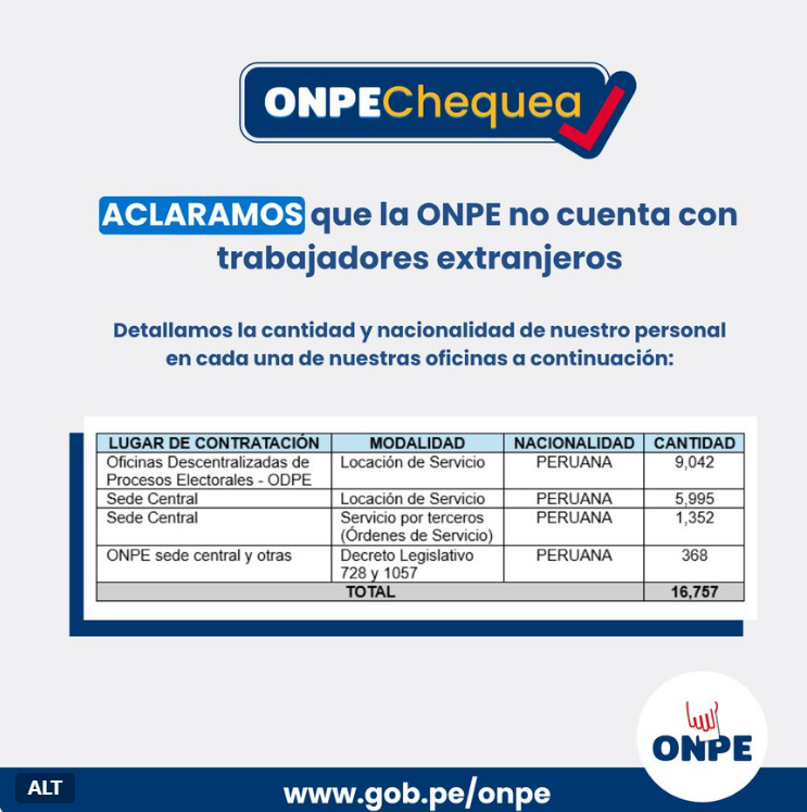 El 20 de abril de 2026, la ONPE publicó un pronunciamiento oficial en su cuenta de X donde precisó lo siguiente: “Aclaramos que la ONPE no cuenta con trabajadores extranjeros. Esto fue verificado tras una revisión del personal realizada en atención al requerimiento de la JNJ sobre la nacionalidad de quienes integran nuestra institución”.