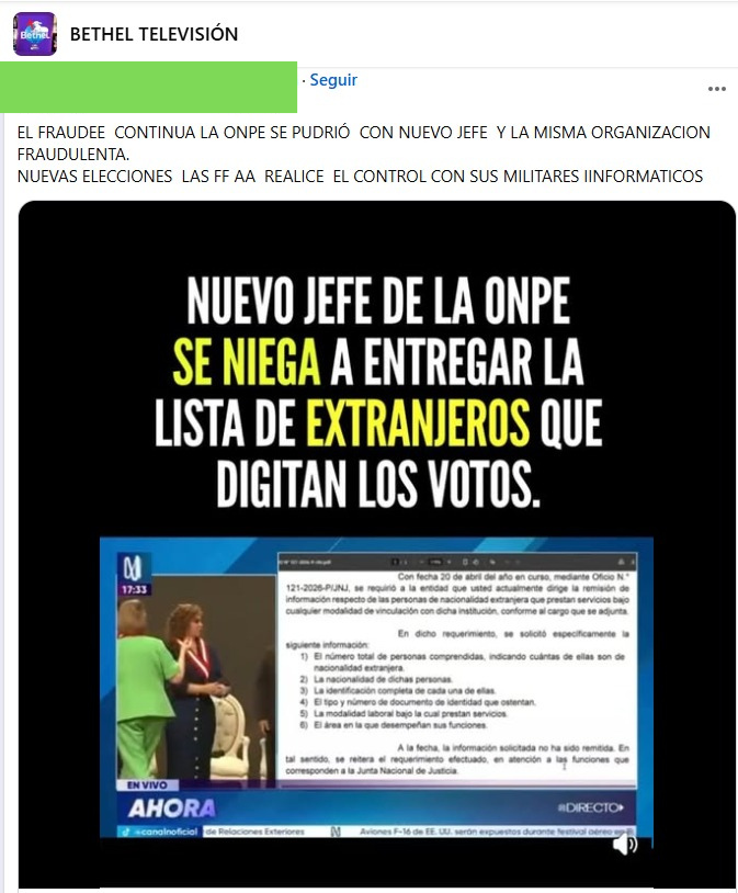 “El fraude continúa. La ONPE se pudrió con nuevo jefe y la misma organización fraudulenta”, señala una publicación difundida en Facebook, acompañada de una imagen con el mensaje: “Nuevo jefe de la ONPE se niega a entregar la lista de extranjeros que digitan los votos”.