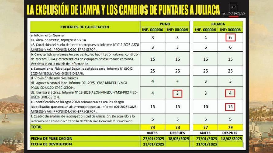 Mas allá de que se haya excluido a Lampa, este cambio en la puntuación sin una justificación técnica clara y en tan corto tiempo despierta de por sí grandes sospechas de un posible direccionamiento a favor de Juliaca. Si bien el informe 000006 fue devuelto para corregir un supuesto «error material», esta subsanación afectó los puntajes de los criterios, los cuales se consiguieron después de largos estudios y años de trabajo ¿Que esto no es sospechoso? La diferencia entre el informe 000006 y el 000008, publicados ambos en la página web de PRONIED, confirman claramente que el proceso de evaluación tuvo alteraciones en un corto periodo de tiempo.