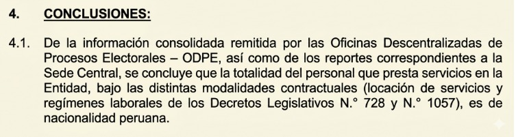“De la información consolidada remitida por las Oficinas Descentralizadas de Procesos Electorales — ODPE, así como de los reportes correspondientes a la Sede Central, se concluye que la totalidad del personal que presta servicios en la Entidad, bajo las distintas modalidades contractuales (…) es de nacionalidad peruana”.
