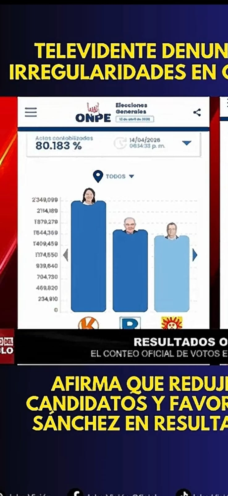 El argumento del televidente se basa en dos capturas de pantalla que tomó a los resultados de la página oficial de la ONPE en diferentes horas. El hombre explica que la altura de las cabezas de los candidatos indica el número de votos en referencia a la barra numérica de la izquierda: