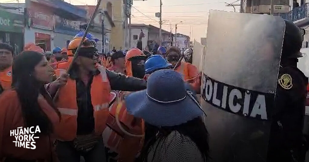 Trabajadores de construcción civil de Huancayo son agredidos por la Policia cuando marchaban en rechazo de la muerte de su dirigente Arturo Cárdenas. pic.twitter.com/0WC6X29pby
