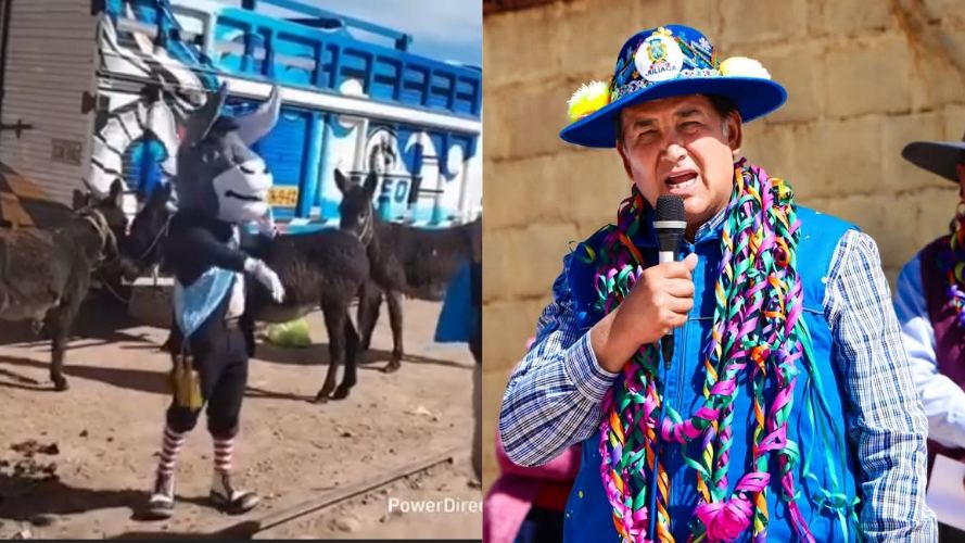 Durante las manifestaciones realizadas este martes en Juliaca, un grupo de pobladores realizó una creativa y satírica representación del alcalde Óscar Cáceres, recordando su polémica frase «Cuando el burro habla, los otros burros callan», dicha en una reunión sobre inseguridad ciudadana donde ordenó callar a dirigentes que lo cuestionaban.
