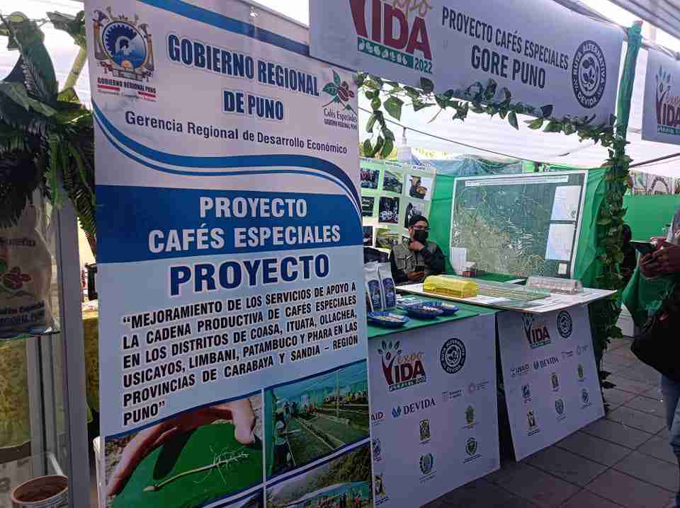 Organizaciones productoras de café de la región Puno, vienen participando de la II EXPOVIDA 2022, en la ciudad de Puno, el Gobierno Regional a través del proyecto denominado “Mejoramiento de los servicios de apoyo a la cadena productiva de cafés especiales”, viene siendo parte de esta feria.