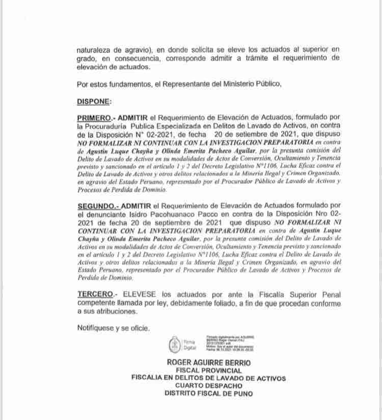 La cual disponía el archivamiento de la denuncia contra el gobernador regional de Puno Agustín Luque y su pareja Olinda Emérita Pacheco Aguilar, ayer finalmente se conoció que la investigación por lavado de activos contra mencionados personajes continuará.