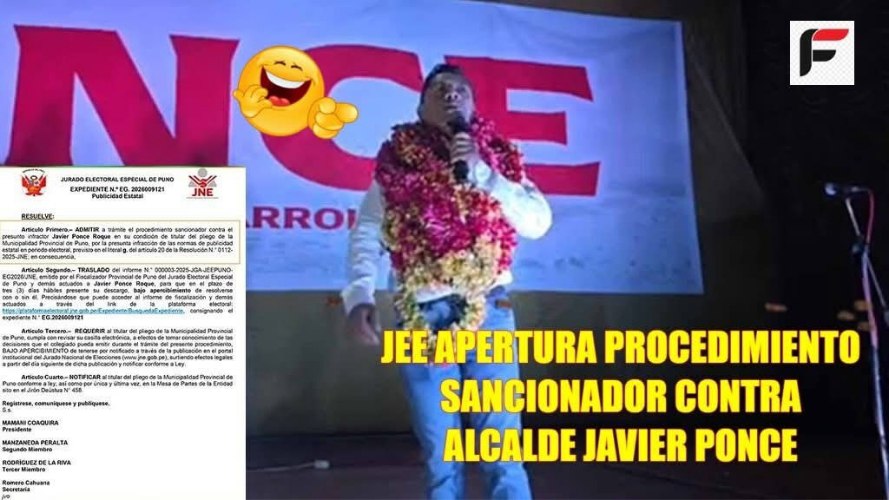 El Jurado Electoral Especial (JEE) de Puno admitió a trámite un procedimiento sancionador contra el alcalde provincial de Puno, Javier Ponce Roque, por la presunta difusión de publicidad estatal prohibida durante el periodo electoral, a través de un panel de obra instalado por la Municipalidad Provincial de Puno.