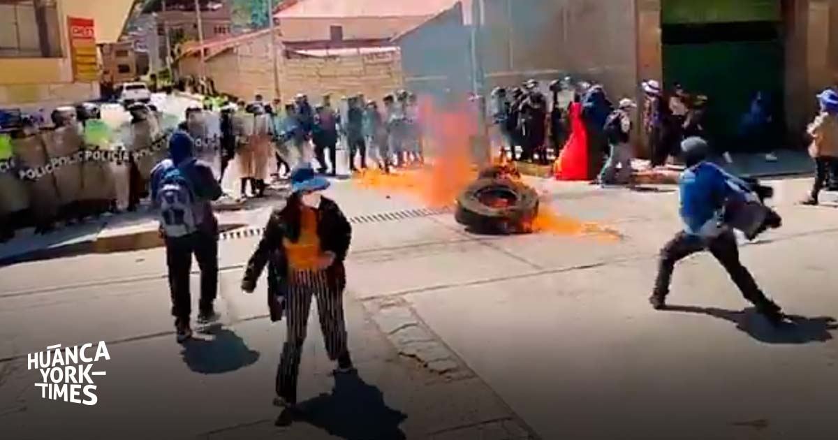 Esta mañana se registró el enfrentamiento entre estudiantes de la Universidad Nacional de Huancavelica (UNH) y miembros de la Policía que resguardaban el trayecto al colegio donde congresistas y ministros realizaban una sesión descentralizada de la Comisión de Defensa del Consumidor.